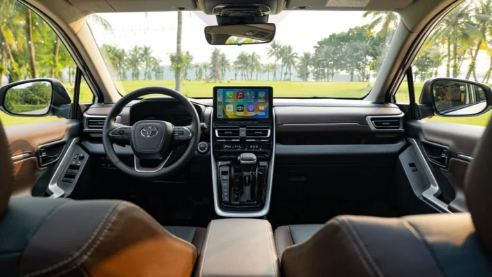 Khoang nội thất được thiết kế theo phong cách hiện đại, mang lại không gian rộng rãi hơn với ghế bọc da hoàn toàn. Xe trang bị cụm đồng hồ với màn hình đa thông tin 7 inch, cùng màn hình giải trí nổi 10,1 inch hỗ trợ kết nối không dây với điện thoại thông minh, tạo cảm giác cao cấp. Ngoài ra, Innova Cross còn sở hữu điều hòa tự động, phanh tay điện tử, giữ phanh tự động và cửa cốp mở điện.